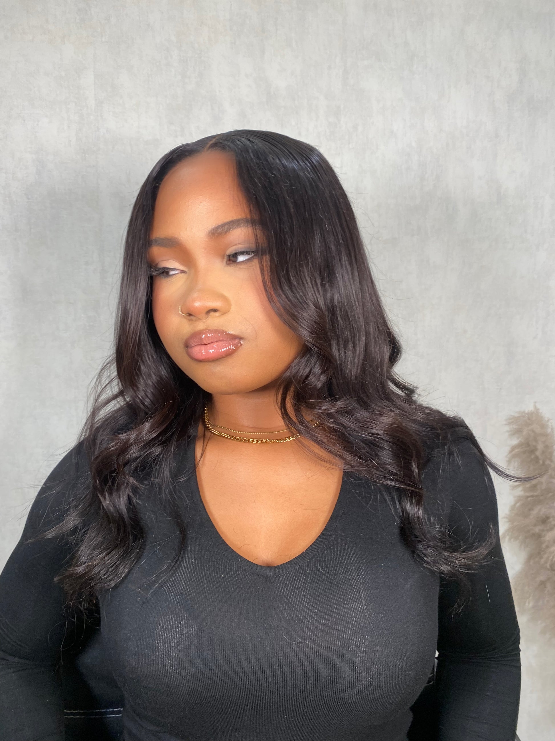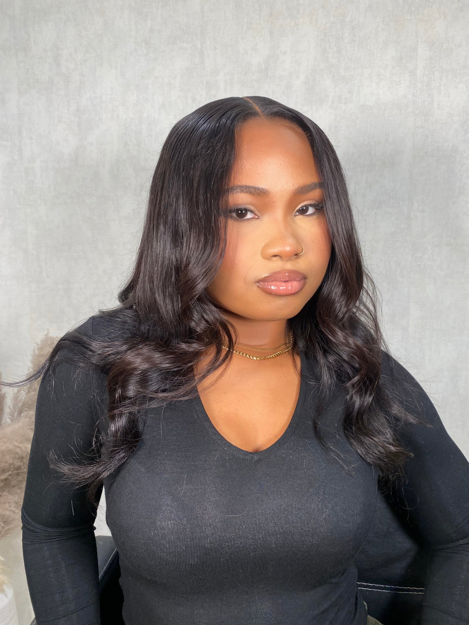 Model wearing 16" pre-made wig, 6x6, HD lace , 180%, Body Wave