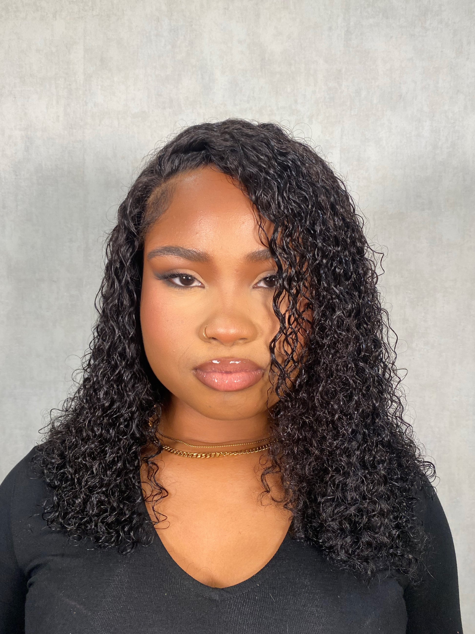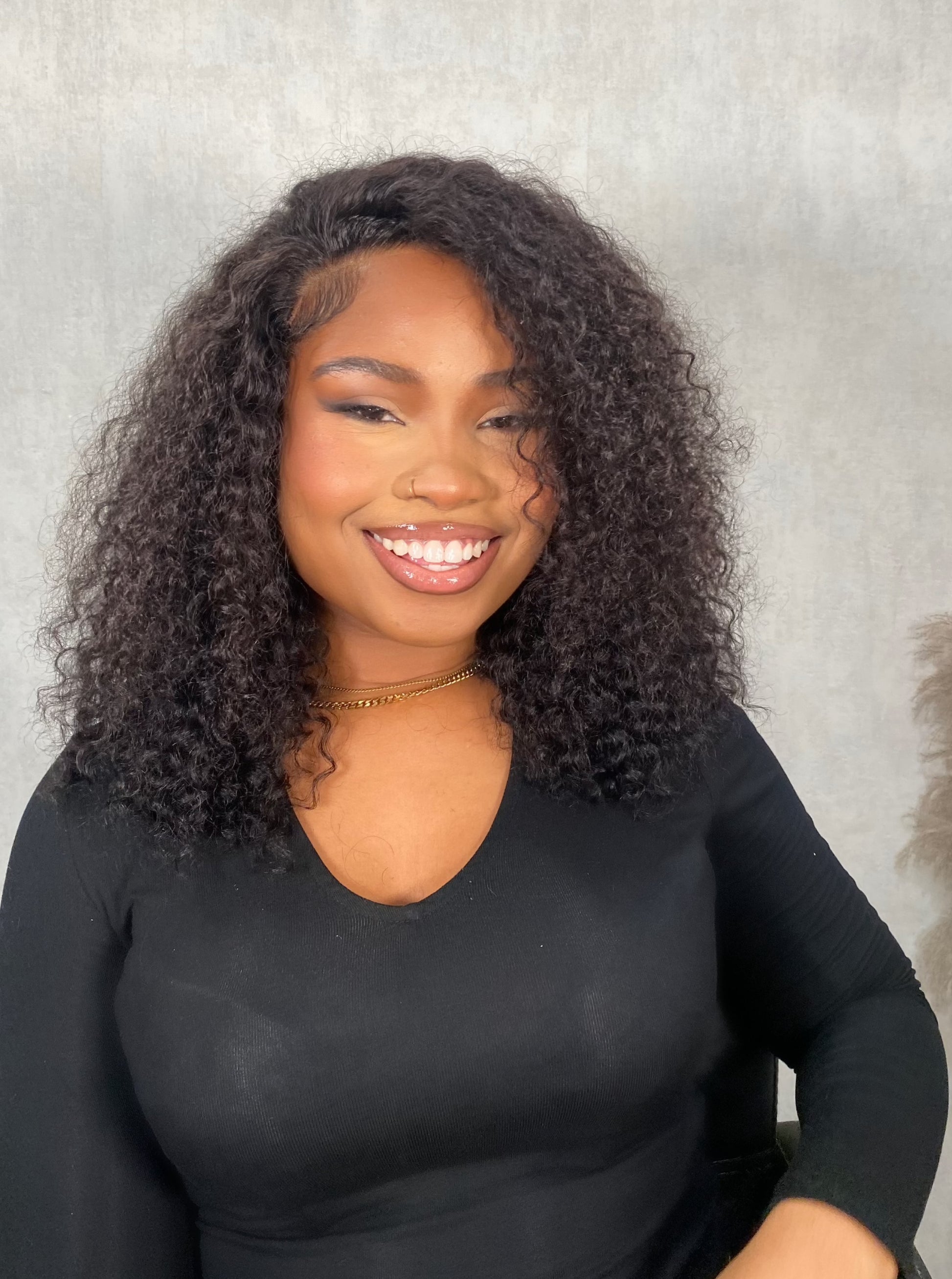 Model wearing 16" pre-made wig, 6x6, HD lace , 180%, Spanish Curly
